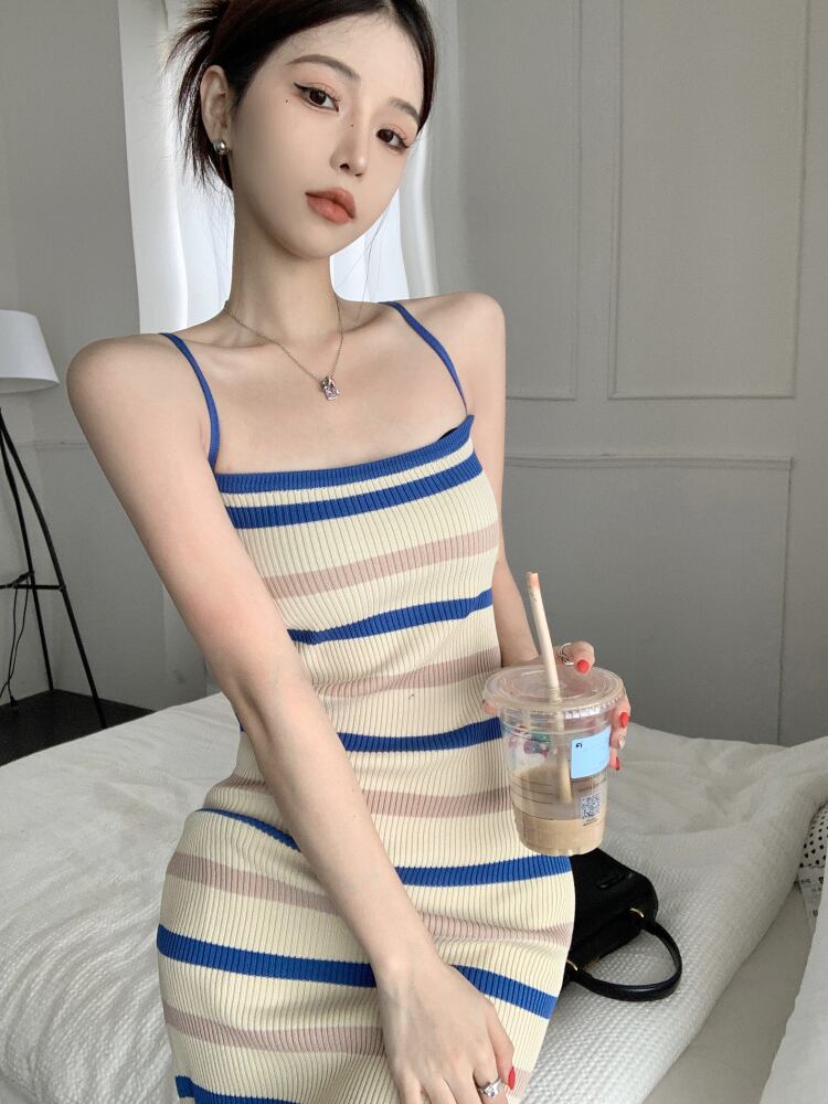 セクシーなミディストラップドレス春スリムニットストライプドレス Vestidos ビーチスタイルロングレディドレス スプリング 春物