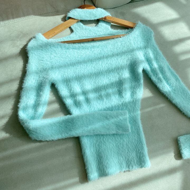セクシーなミンクカシミヤクロップトップススリムオフショルダーピンクセーター優しいホルターニットモヘアソフトセーター