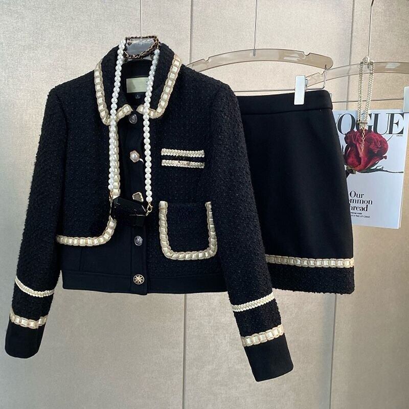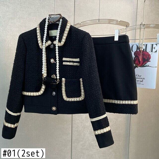 冬の小さな香り黒ツイードコートウールジャケット 2 スーツラップヒップミニスカートドレスセット服 ブラック ウィンター 冬物