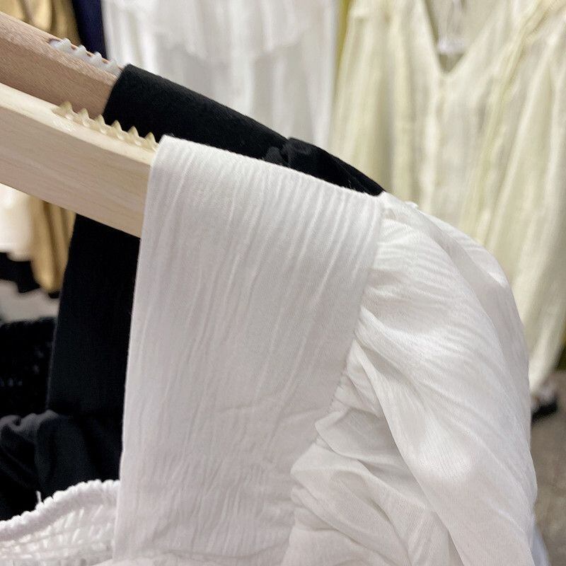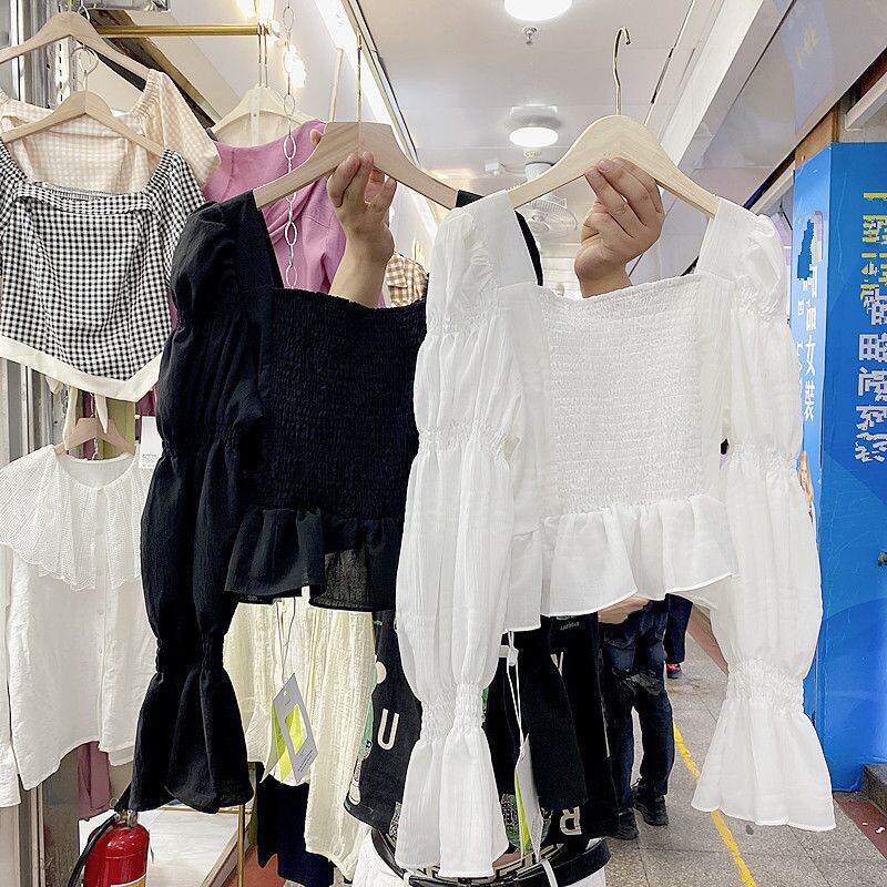 ウエストシックなクロップトップススクエアカラーフリル長袖白シャツフリルシャツセクシーなブラウス ロング ホワイト スクウェア
