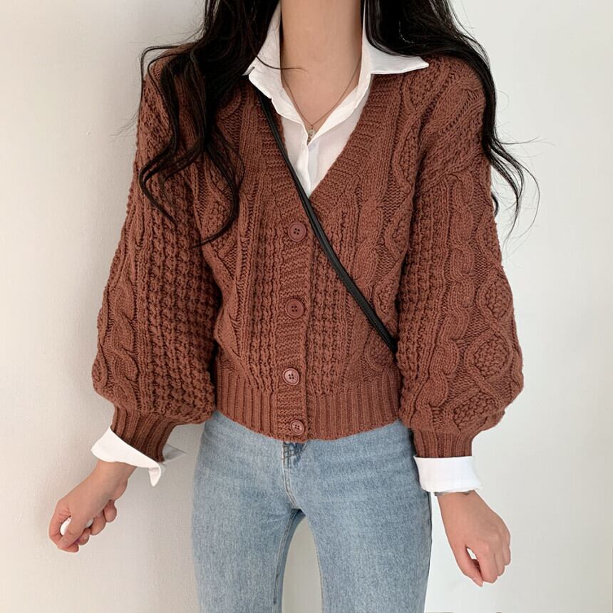 グレー ツイスト セーター コート レディース ルーズ ワイルド Vネック ランタン スリーブ ショート ニット カーディガン ジャケット クロップド カーディガン ランタンスリーブ