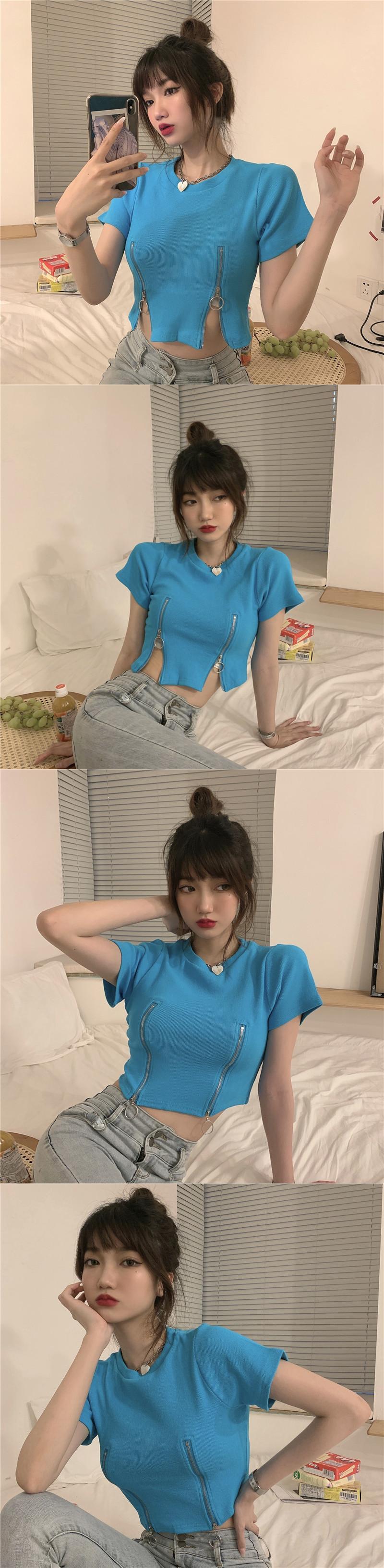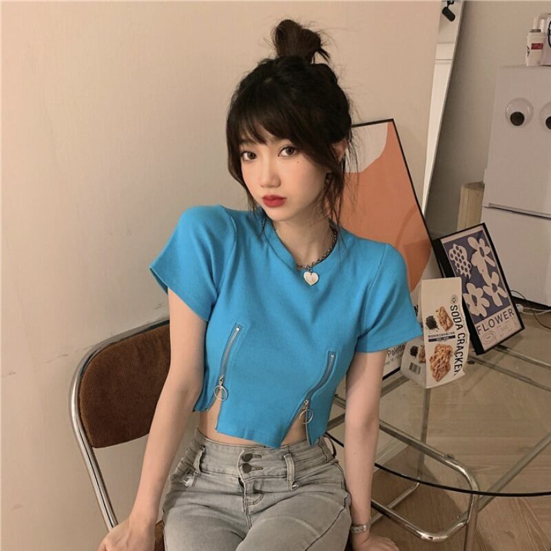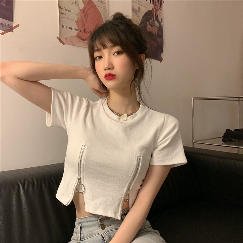 セクシーなウエストホワイトクロップトップススリム半袖 Tシャツスリム夏 Tシャツ Y2k グランジ服グラフィックジップ Tシャツ綿 ショート コットン ハーフスリーブ サマー 夏物