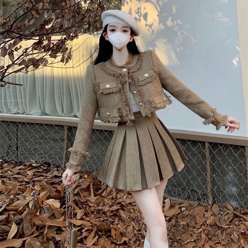 ショート ツイード コート テル カーディガン ミニ プリーツ スカート 2 点セット シックな秋ジャケット オータム 秋物