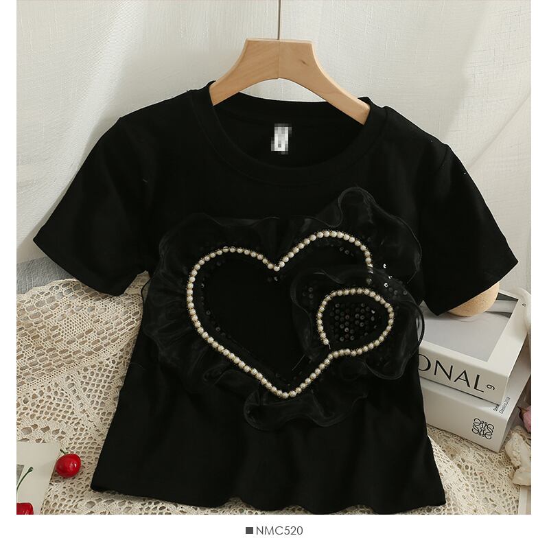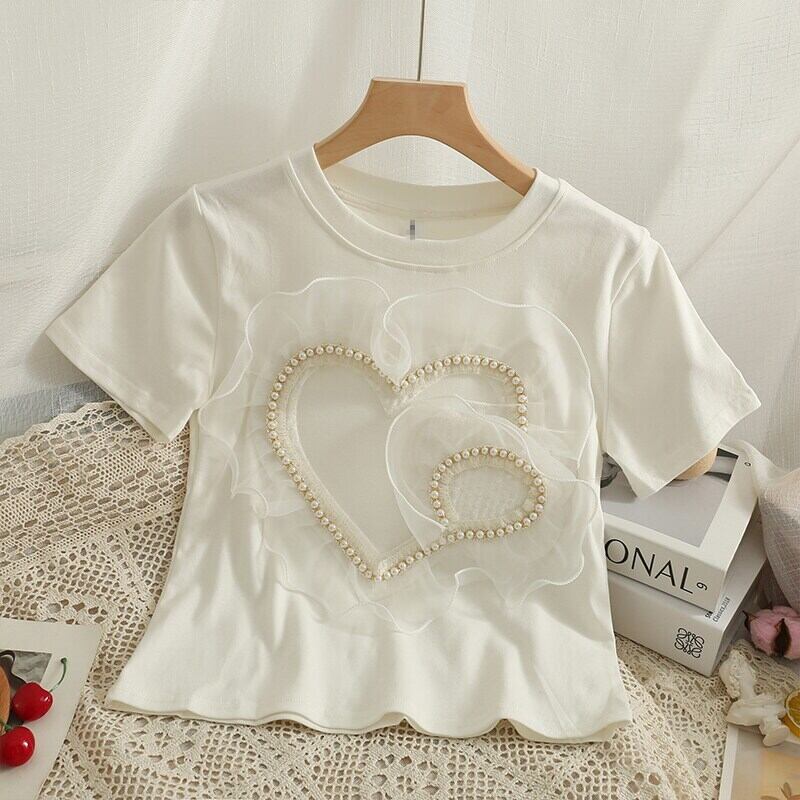 グラフィック Tシャツパッチワーク真菌メカクロップトップスラウンドネック半袖ラブハートビーズ Tシャツ白 Tシャツ ショート ホワイト ハーフスリーブ Oネック