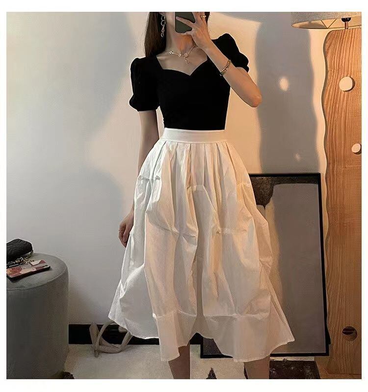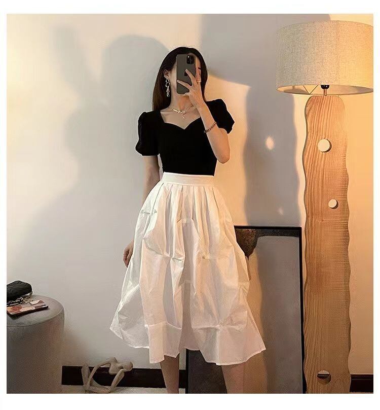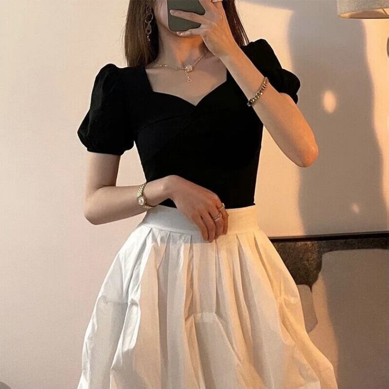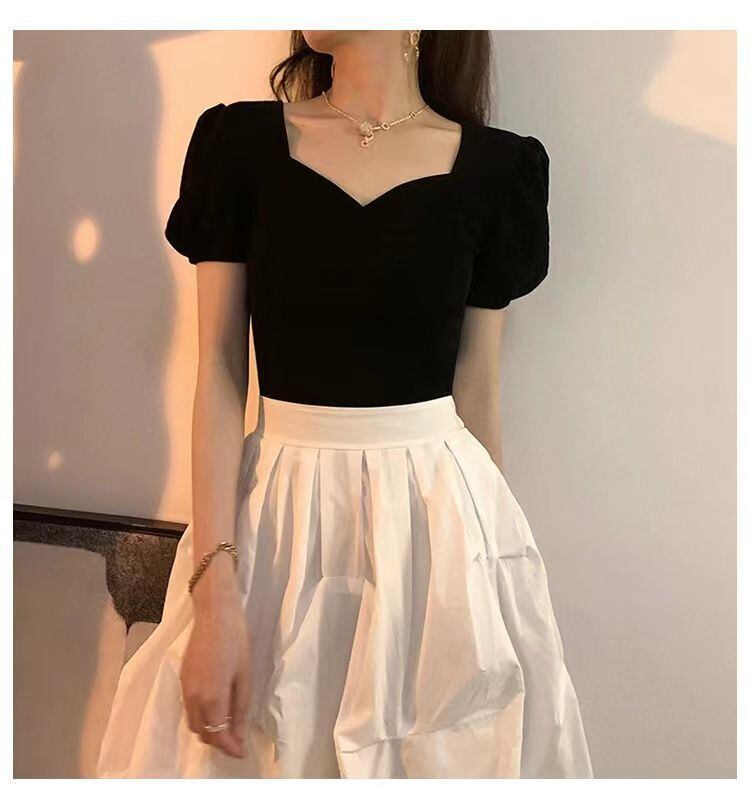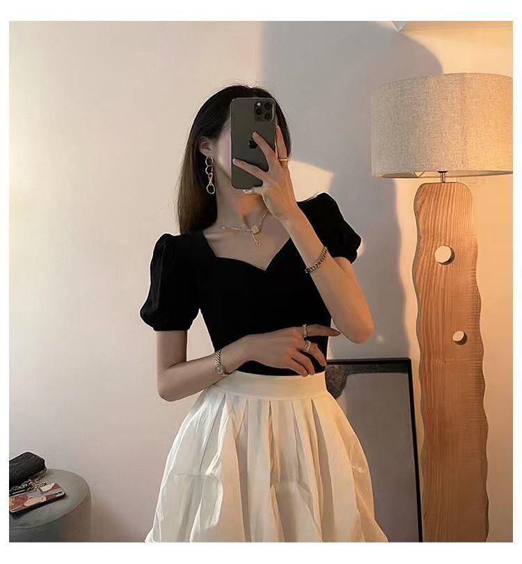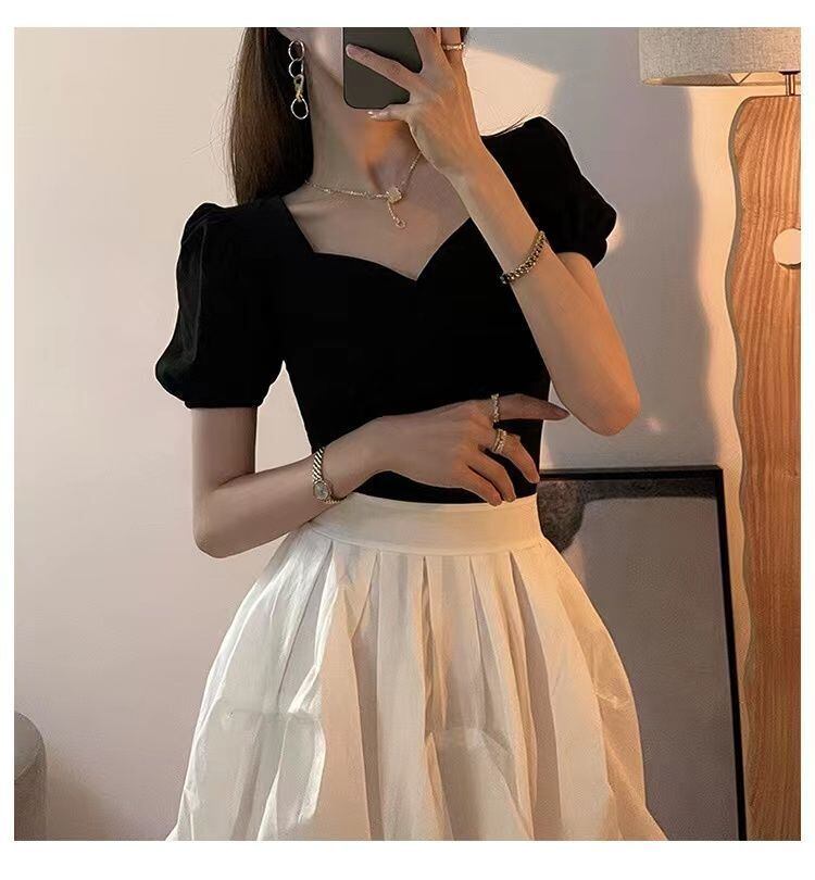 フレンチバブル半袖 Tシャツワイルドスリム V ネック黒 Tシャツ特大ニットトップス春 Tシャツブラウス ショート ブラック ハーフスリーブ スプリング 春物 Vネック
