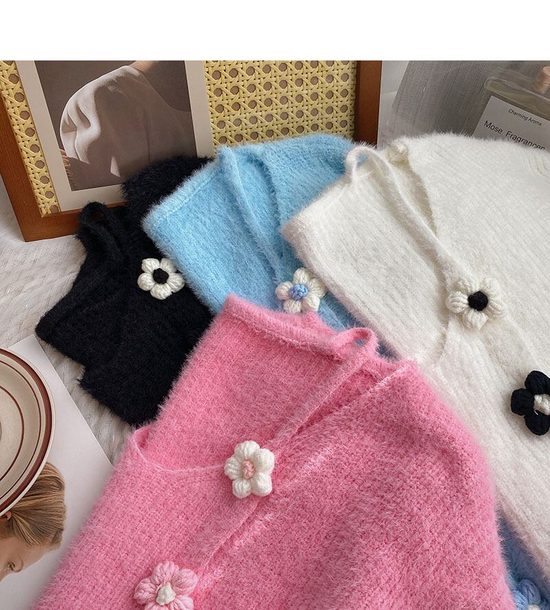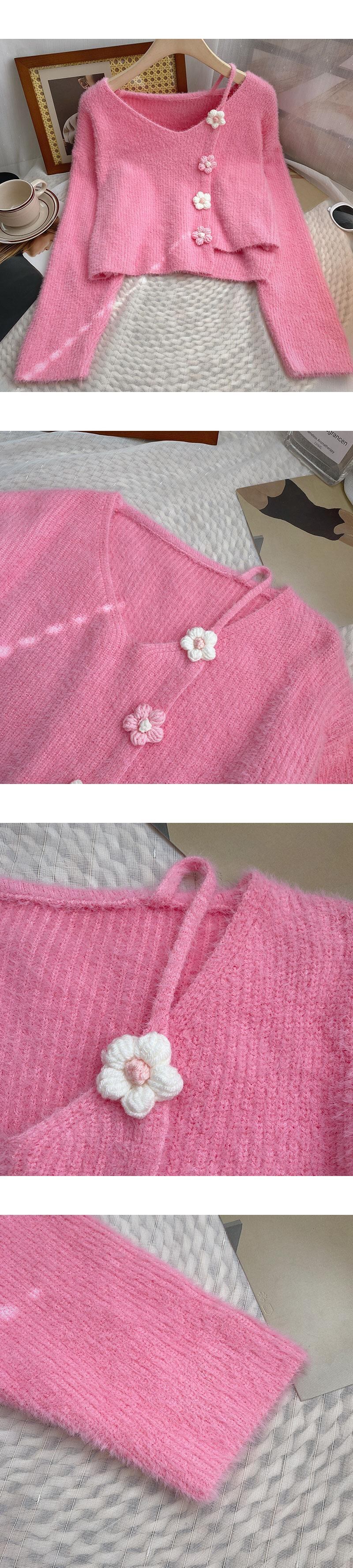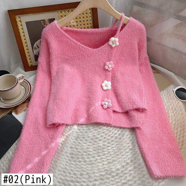 作物 3D 花ピンクのセーターのジャンパープルオーバーセーター優しいシックな V ストラップレストップス不規則なニットセーターフリース フラワーデザイン
