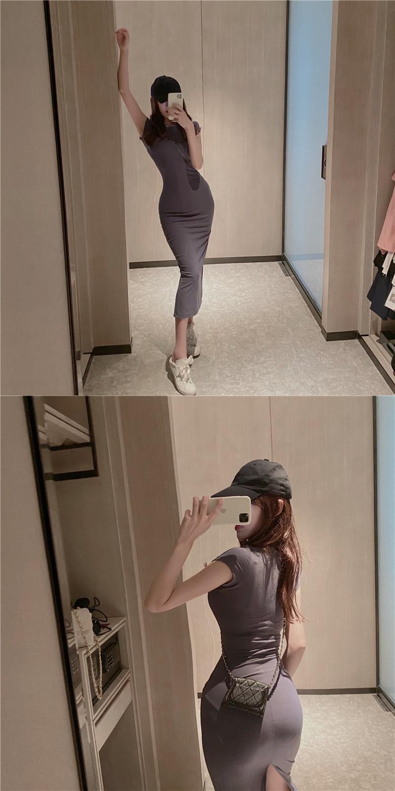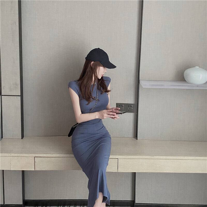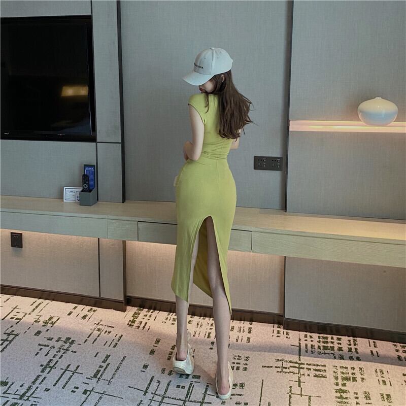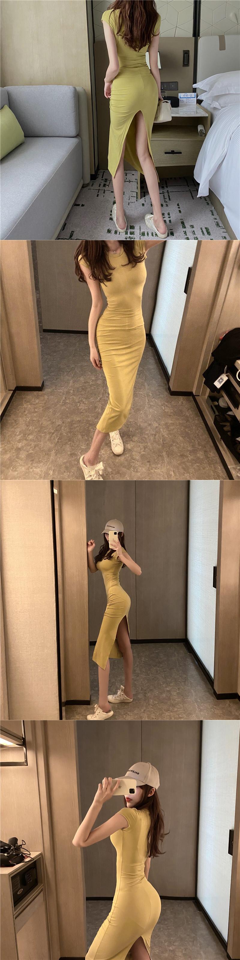 夏ワイルドラウンド半袖 Tシャツドレスヒップスプリット Ropa デ Vestido Feminino ローブ綿弾性 ショート コットン ハーフスリーブ エラスティック 伸縮 サマー 夏物
