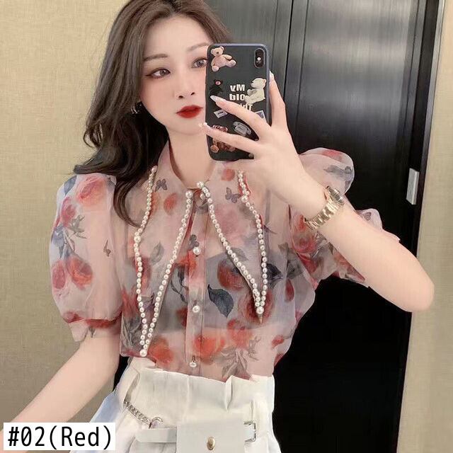 De Moda ビーズ半袖シャツ グリーン フローラル パースペクティブ シャツ レディース シックなブラウス トップス ショート ハーフスリーブ 花柄