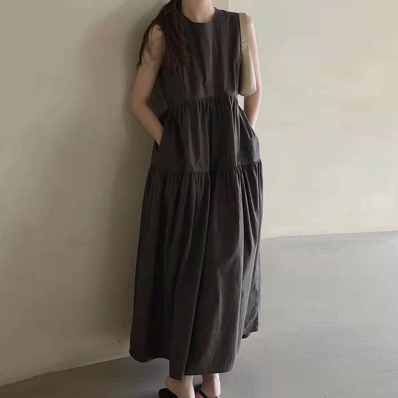 ミニマリスト O ネックフリルプリーツルーズノースリーブドレスミディ Vestidos デ黒ベストドレスポケットタンク野生 ブラック Oネック