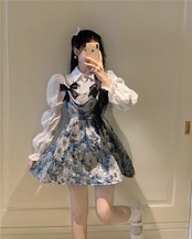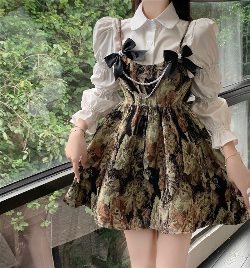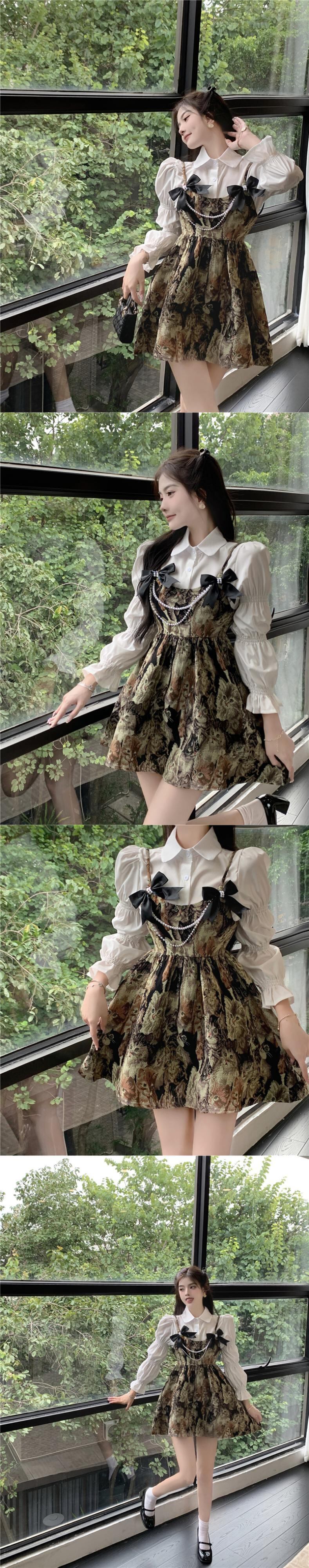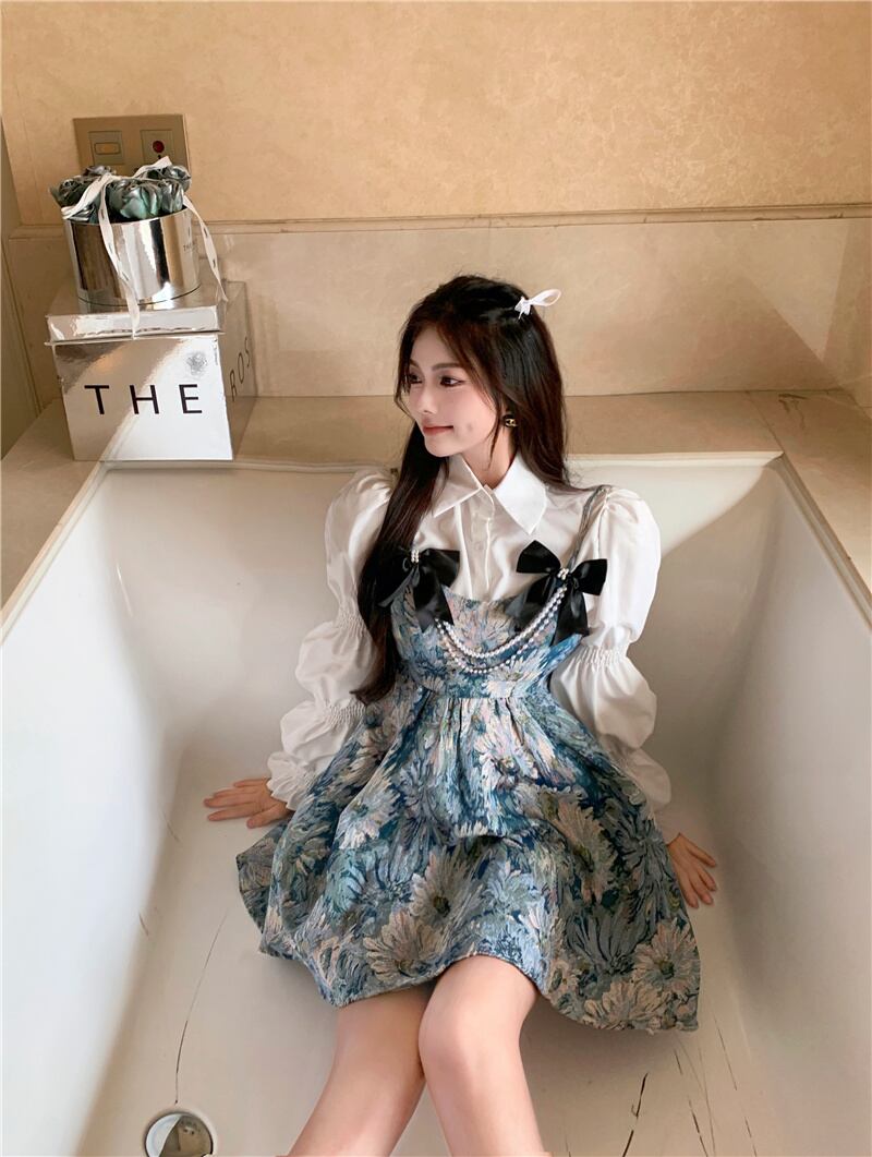 サスペンダー油絵ドレス春ツーピースセット段 Faldas 白シャツトップス春ブラウス緩い ホワイト スプリング 春物