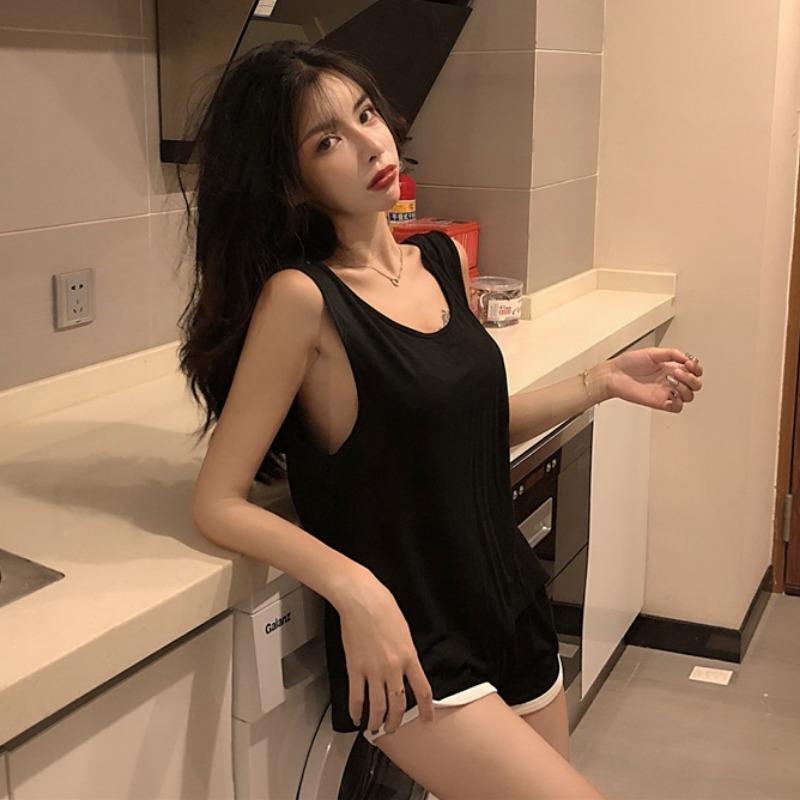 セクシーなノースリーブベスト中空白背中 Tシャツルース V ネック春夏野生の黒 Tシャツ Tシャツ ホワイト ブラック スプリング 春物 サマー 夏物 Vネック