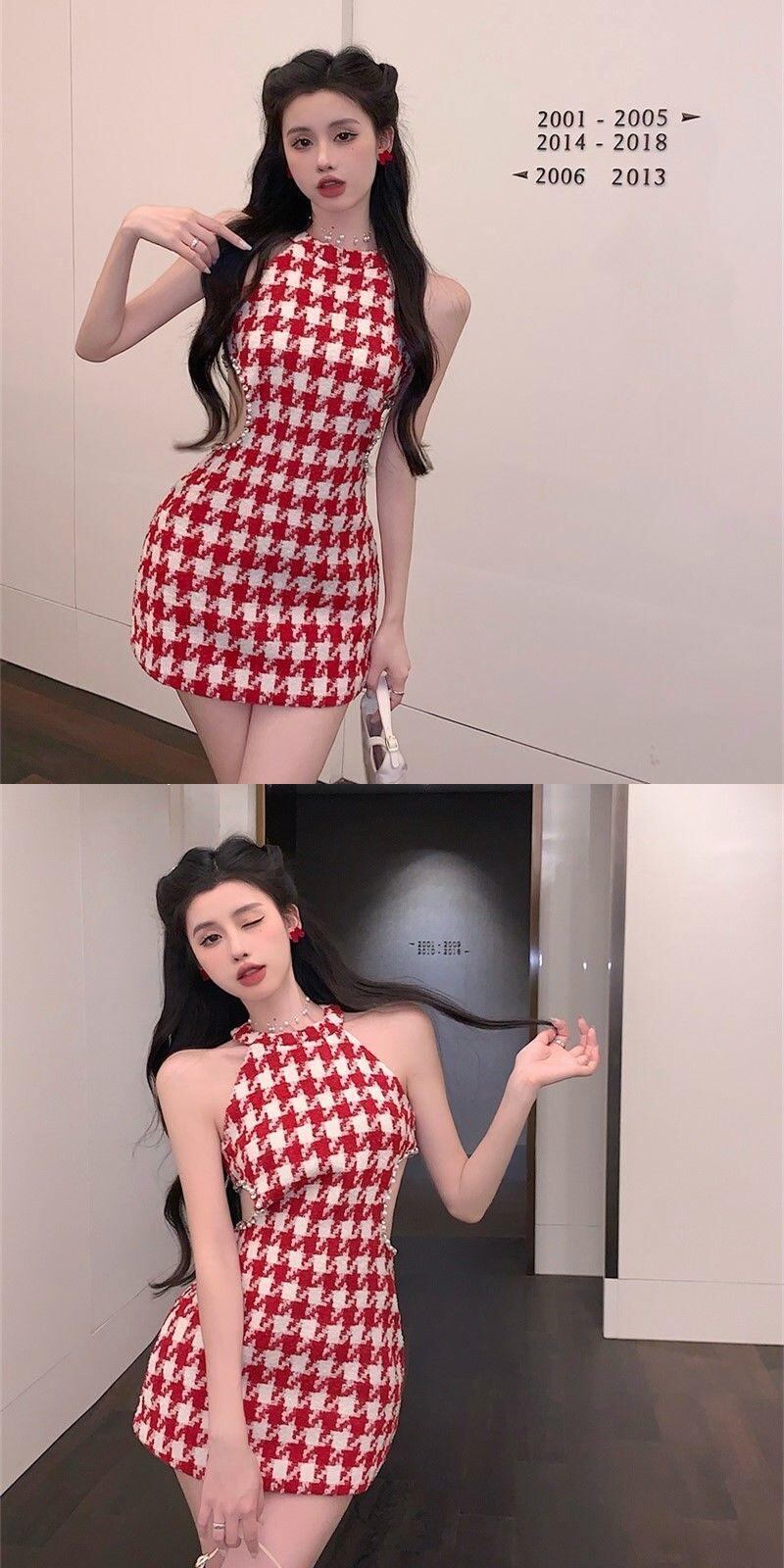 フレンチラインストーンストラップホルターレッド千鳥格子ドレスローブスリムセクシーなヒップパーティー Vestidos 中空ウエスト