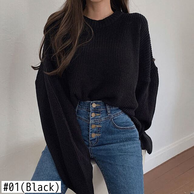 秋の怠惰なシンプルな O ネックプルオーバー緩い無地長袖ニットセーター黒、白トップスのセーターデ ロング ホワイト ブラック オータム 秋物 Oネック ソリッドカラー