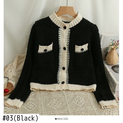 コントラスト O 長袖ショートセータースリムシングルブレストセーター秋セータープル黒クロップドカーディガンニットジャケット ロング ブラック オータム 秋物