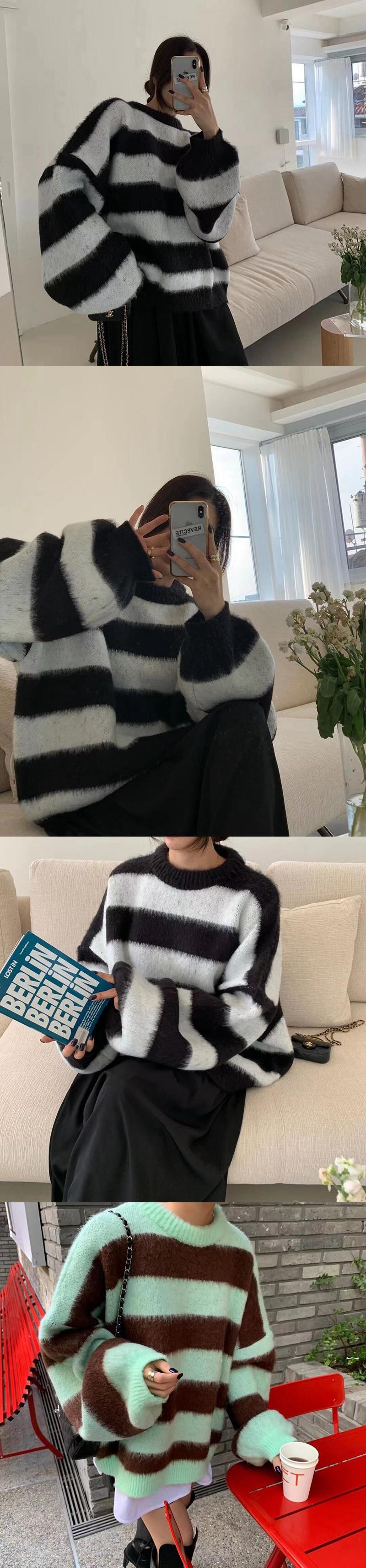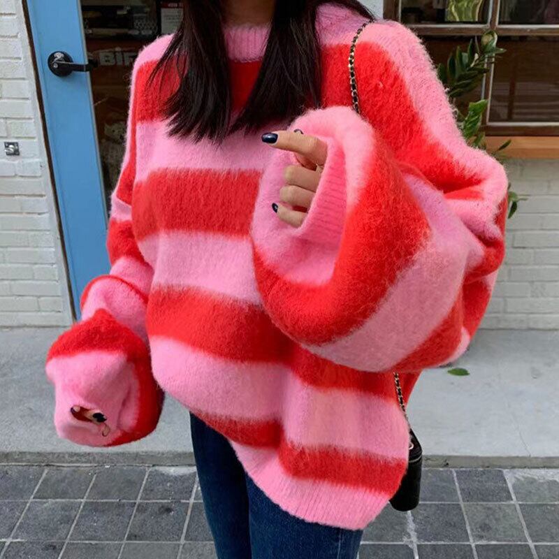 ラウンドネックプルオーバーコントラストルーズランタンスリーブストライプセータージャンパー Y2k セーターセーター厚いニットトップ Oネック