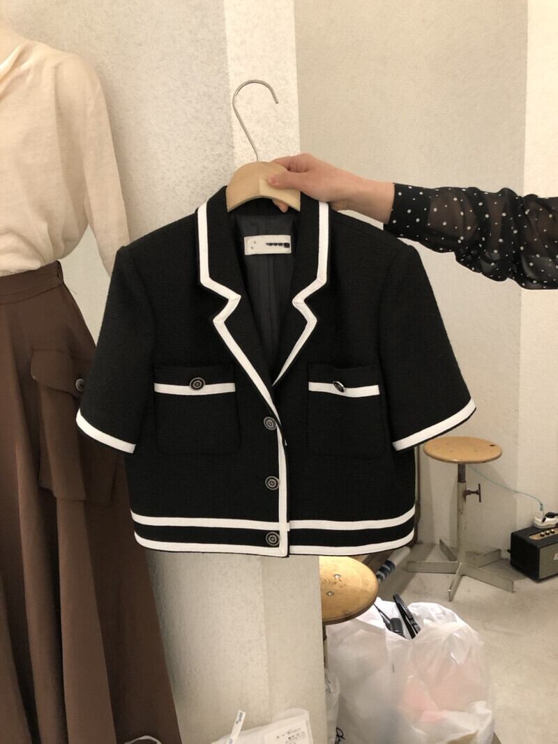 気質ツイード白半袖レディース ジャケット クロップ夏スリム ブラック スーツ ウール カーディガン トップ ショート ホワイト ハーフスリーブ サマー 夏物