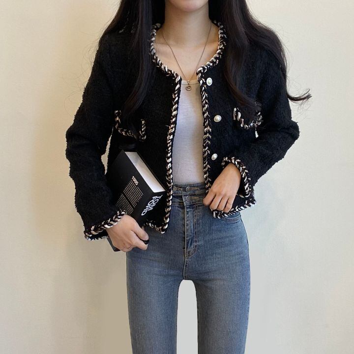 春秋ショート黒ツイードコートシックなチャケータ jaqueta スーツ格子縞のジャケットカーディガン ブラック スプリング 春物 オータム 秋物