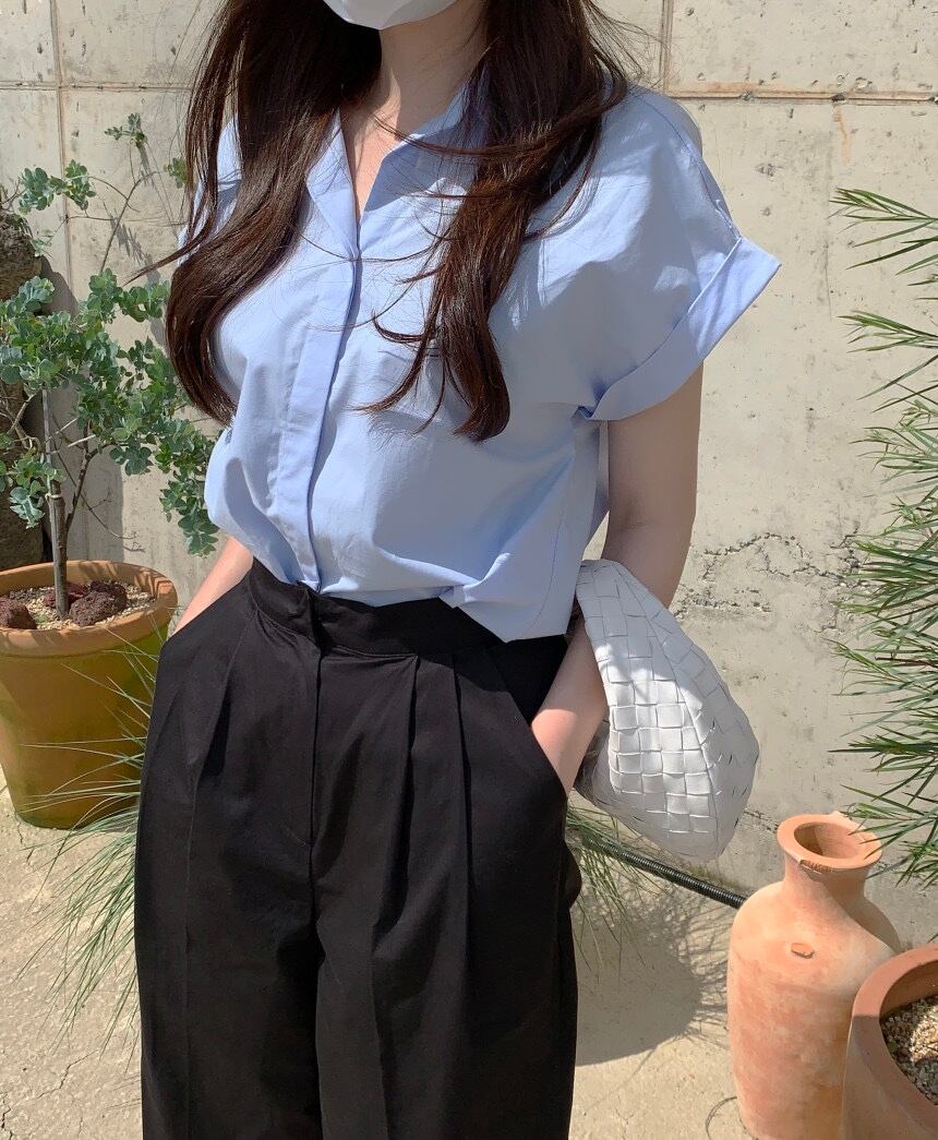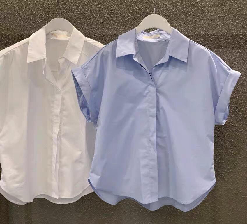 春シングルブレストルーズラペルワイルド半袖シャツ無地トップ OL シャツブラウス ショート ハーフスリーブ スプリング 春物 ソリッドカラー