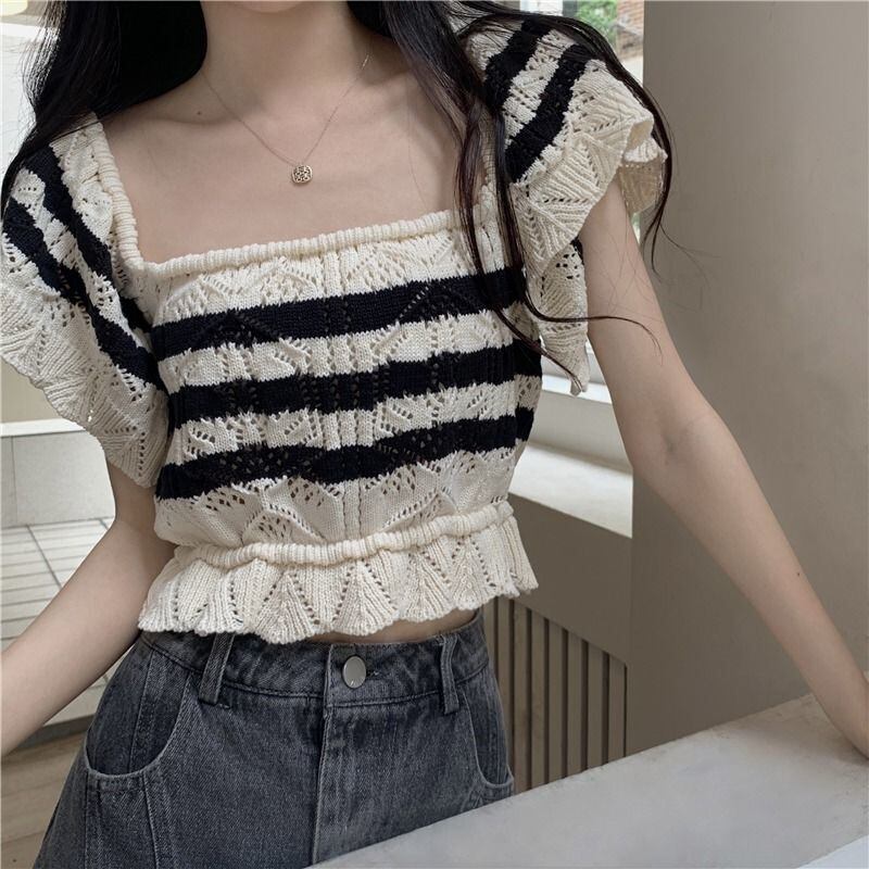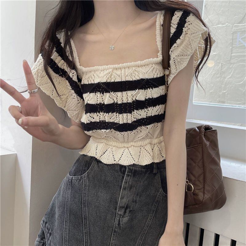 スクエア半袖黒、白のストライプのセーターののセクシーなシックな中空アウトトップスプルオーバーブラウス春スリムニットシャツ ショート ホワイト ブラック ハーフスリーブ スプリング 春物 スクウェア