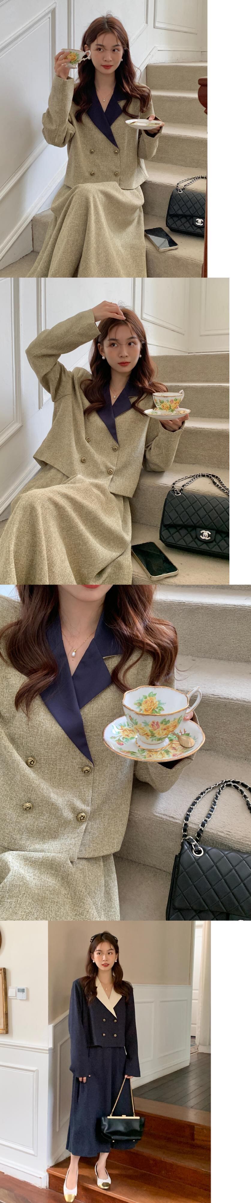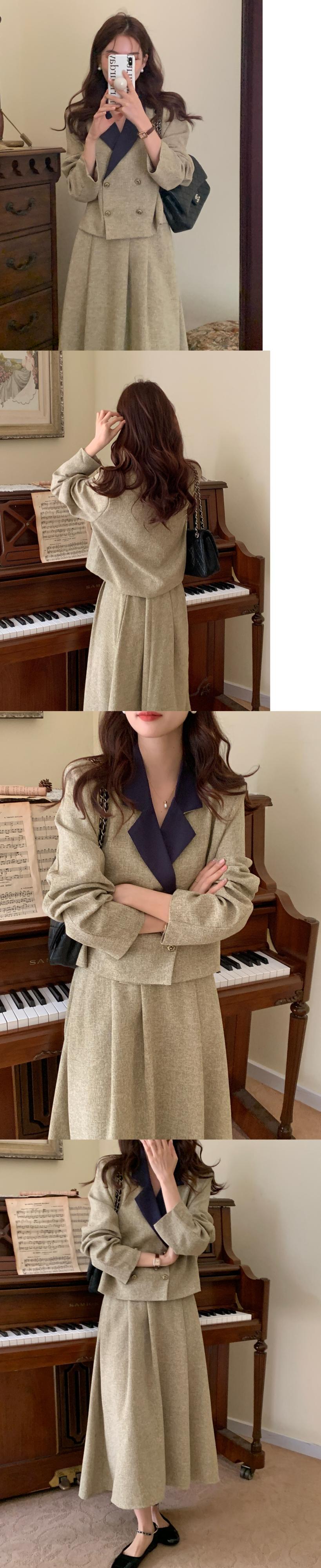 ノッチ付きダブルブレスト ブレザー Feminino 2 ピース セット プリーツ スカート ミディ スタイル ジャケット スーツ