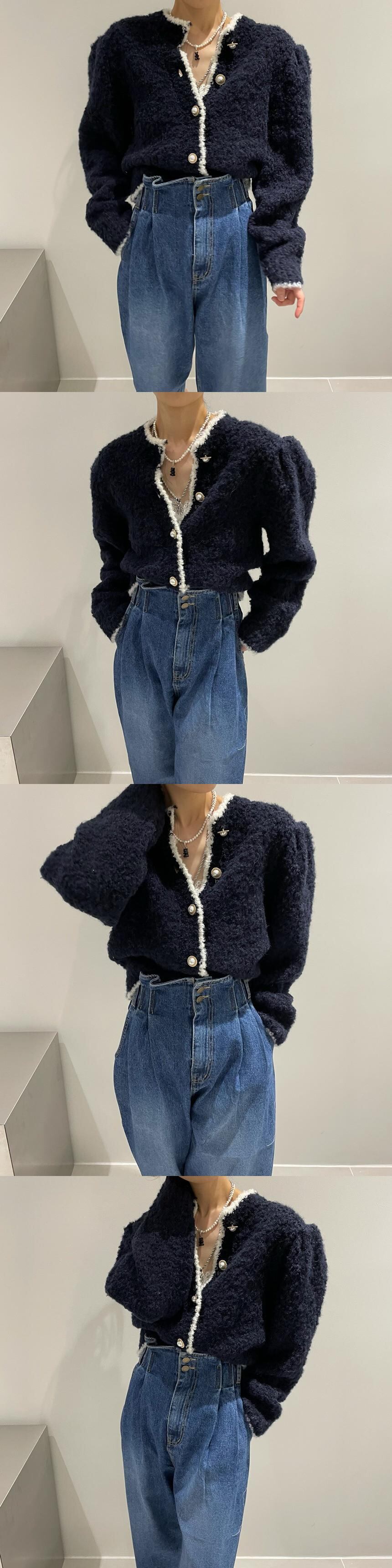 コントラストシックパールボタンファールーズパフスリーブニットセータークロップドカーディガン秋のジャケットスーツセータープル オータム 秋物 真珠