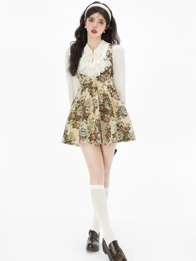 宮殿スタイル白弓シャツジャカードミニ花柄ストラップドレスセットツーピースセット春ブラウストップス ホワイト リボン レース スプリング 春物