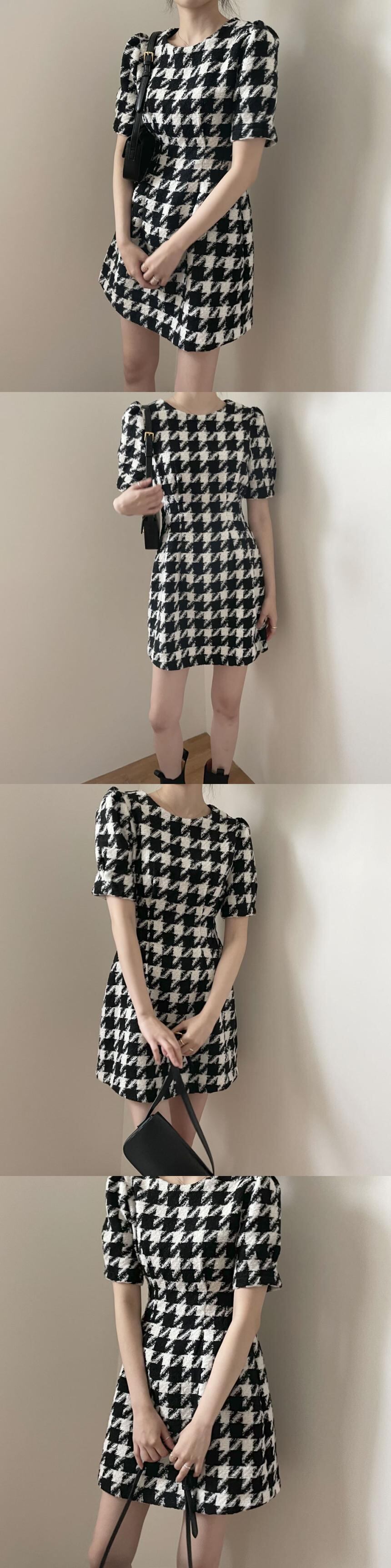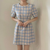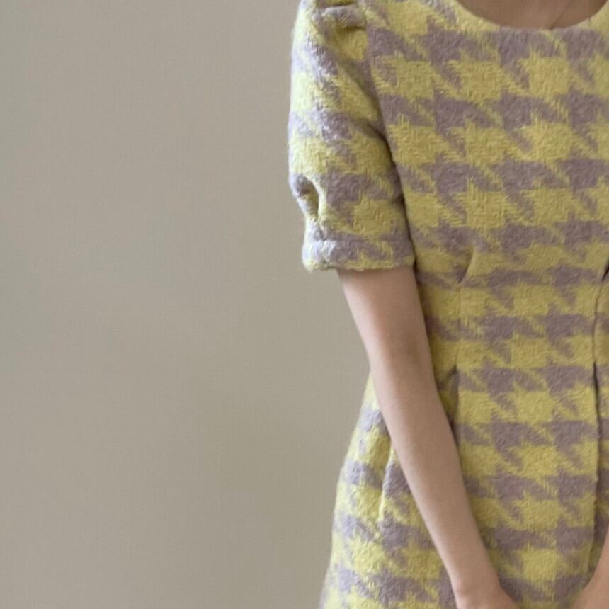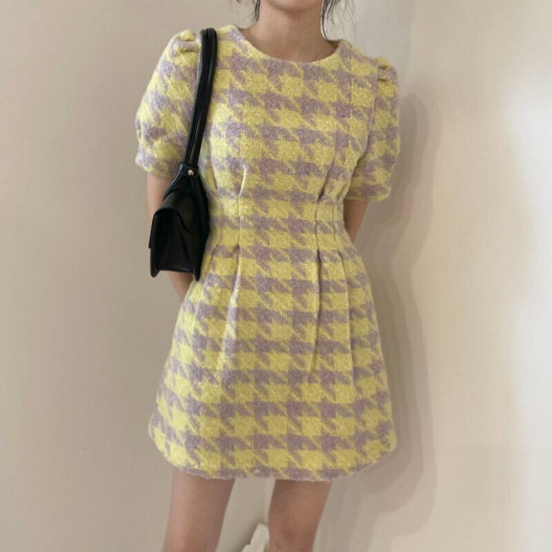 ウエストレトロ気質スリム O ネック半袖ラップヒッププリーツツイード半袖千鳥格子ドレス Vestido ショート ハーフスリーブ Oネック