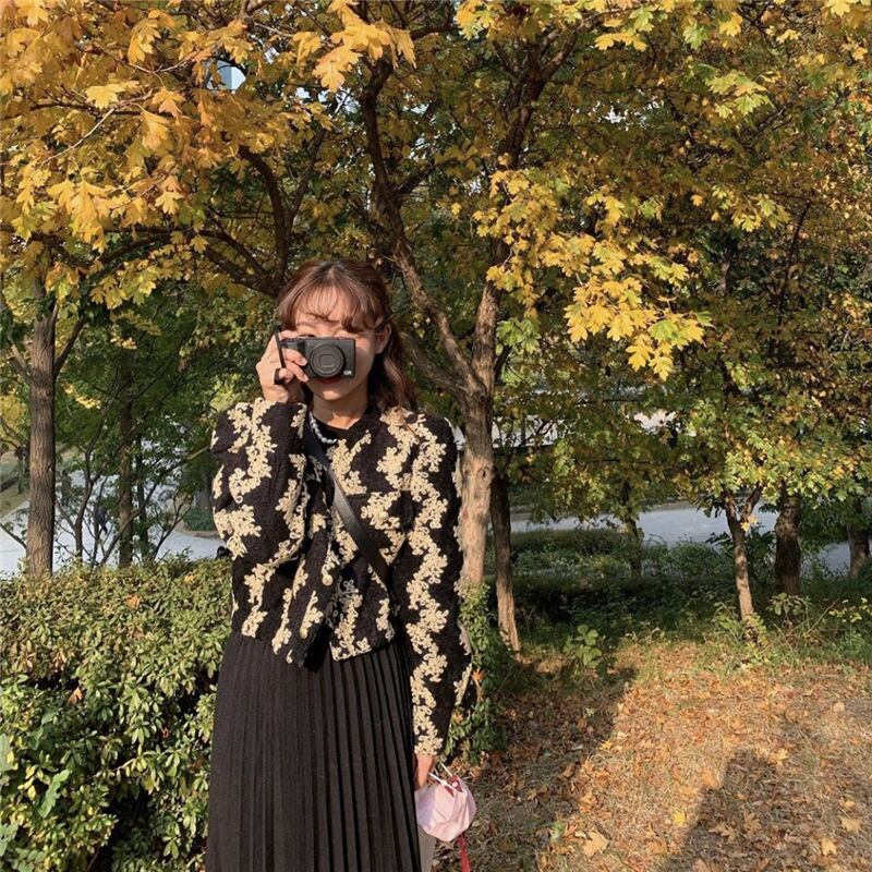 Oネック刺繍ジャカードパフスリーブジャケットショートレトロコート+Aラインウエスト黒プリーツスカート服 レッド ブラック