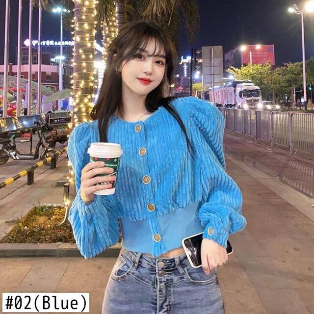 ブルーコーデュロイシャツパフスリーブシックなスリムウエストトップス秋 O シングルブレストブラウスシャツプリーツ オータム 秋物