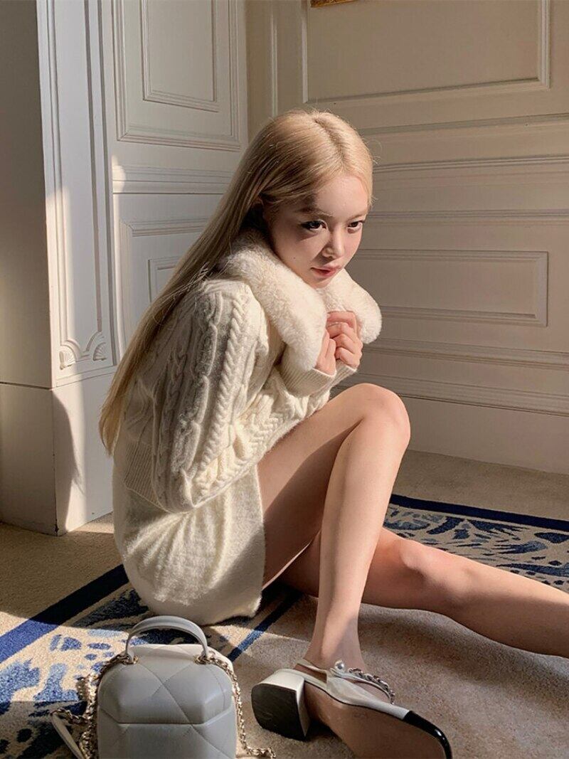 毛皮の襟のセータースリムレトロニットクロップドホワイトカーディガン秋ツイストセータージャケットシャツ オータム 秋物