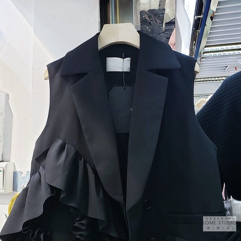 フリル不規則なカーディガンプリーツノースリーブチョッキパッチワーク緩い秋黒ブレザージャケットベスト Ropa ブラック オータム 秋物