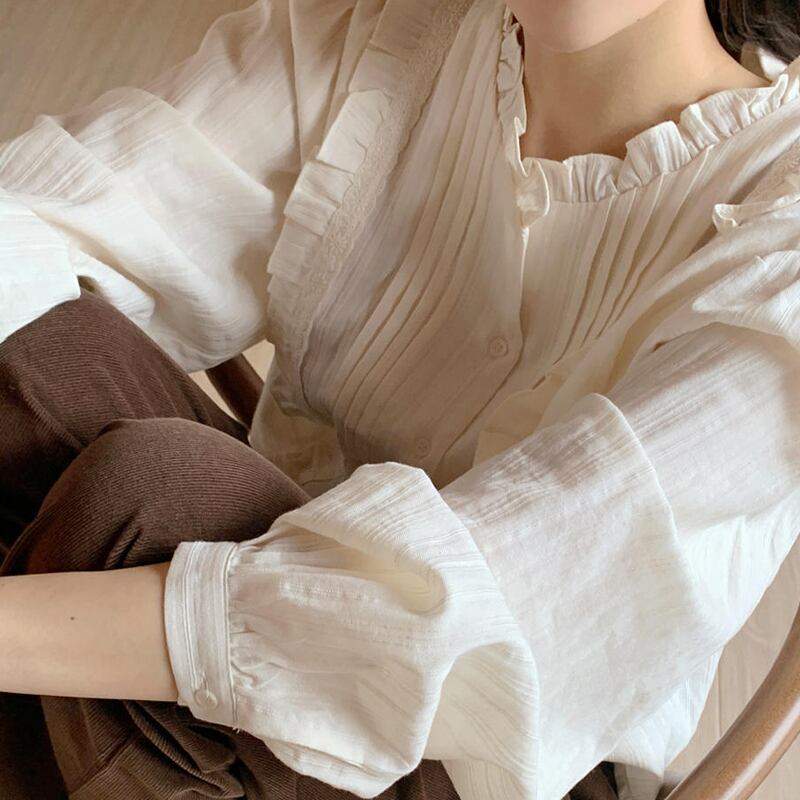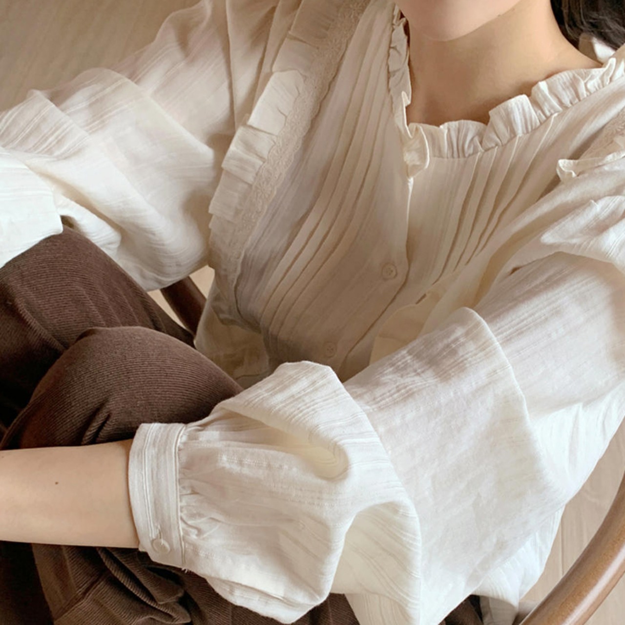 甘宮風 きのこシャツ スタンドカラー 春 トップス プリーツ 長袖 ブラウス レディース OLシャツ レディース ロング 大人ガーリー スウィート キュート カジュアル スプリング 春物