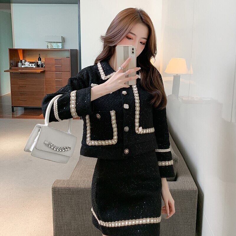 短い黒ツイード コート ブレザー Feminino レトロ スリム ボディコン スカート レディース 2 peice セット スーツ ジャケット春 ショート ブラック スプリング 春物
