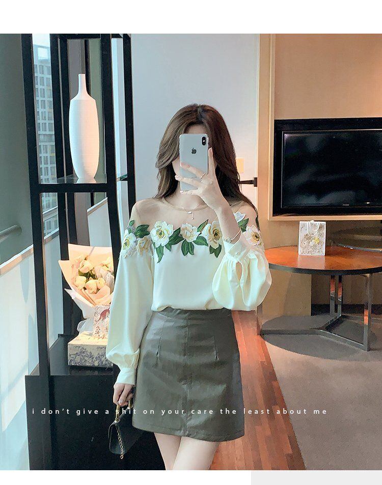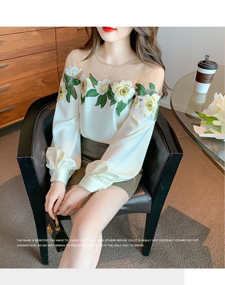 気質メッシュスプライシングローズ刺繍オフショルダー透視シャツ Blusa パフトップスブラウスシック