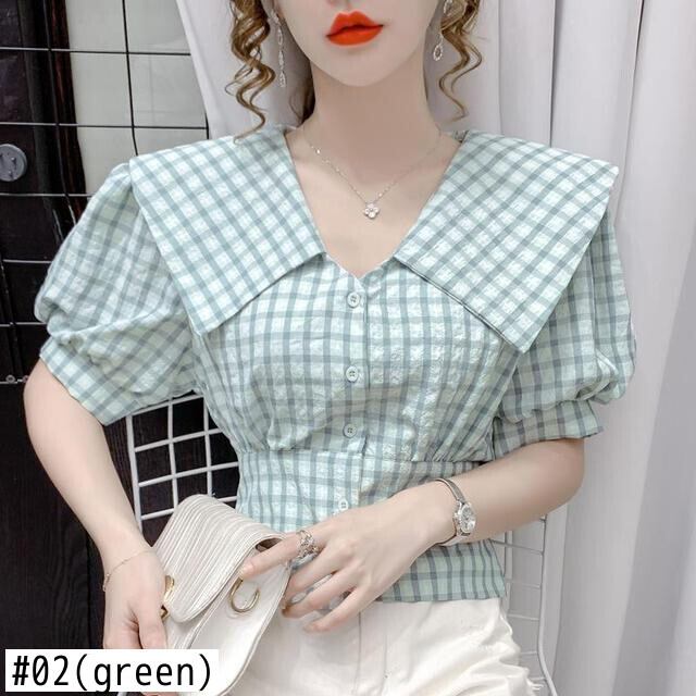 スリムクロップトップスピーターパン襟パフスリーブチェック柄シャツデモーダ春夏ショートブラウス人形シャツ スプリング 春物 サマー 夏物