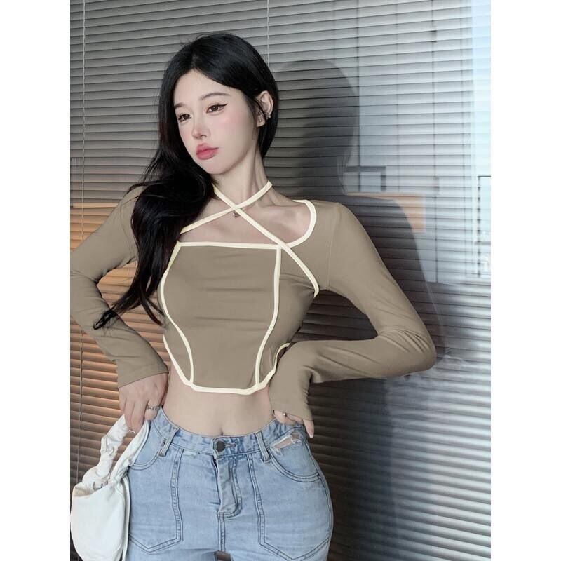シックなセクシーなクロップトップス甘いホルターピンク Tシャツスリムシャツフルスリーブスクエアコントラスト襟 Tシャツブラウス 大人ガーリー スウィート キュート カジュアル スクウェア