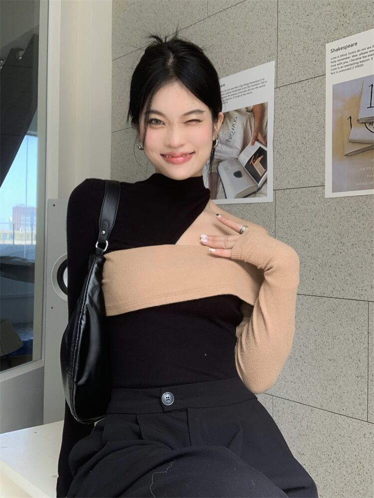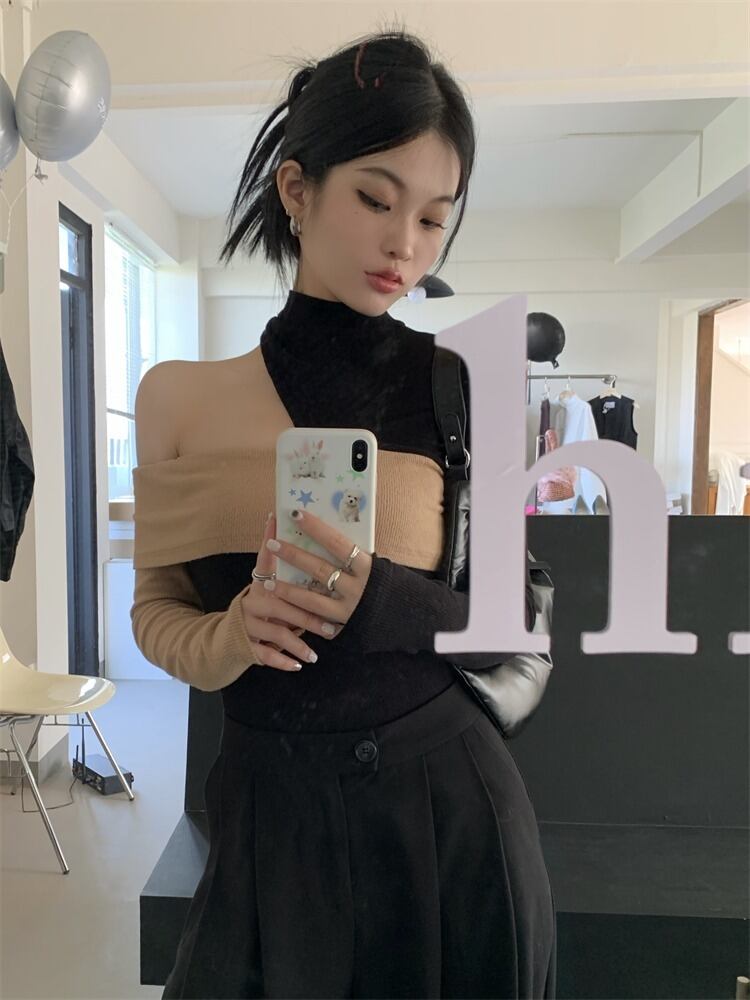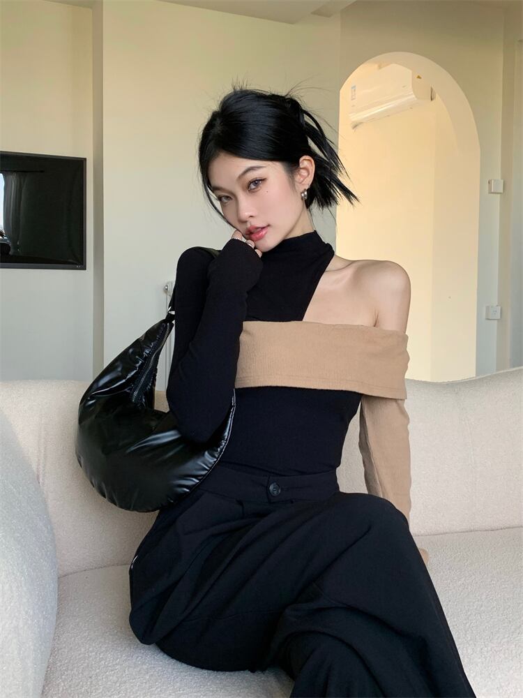 ワンショルダーセクシーなオフニット黒タートルネックセータースリムセクシーなパッチワーク長袖シックなトップスジャージーセーターシャツ ロング ブラック