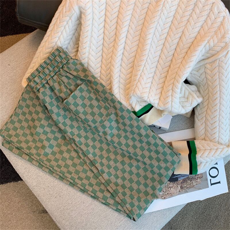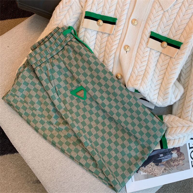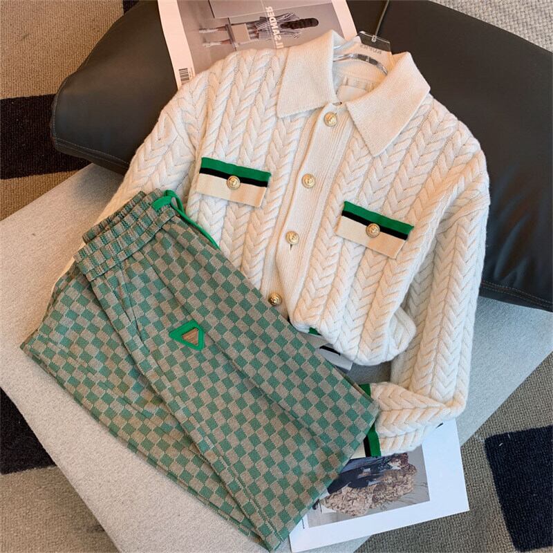 クロップドツイストセーターシングルブレストニットカーディガンコートラペル+ワイドレッググリーンチェッカーボードパンツスウェットパンツ2sets ワイドパンツ
