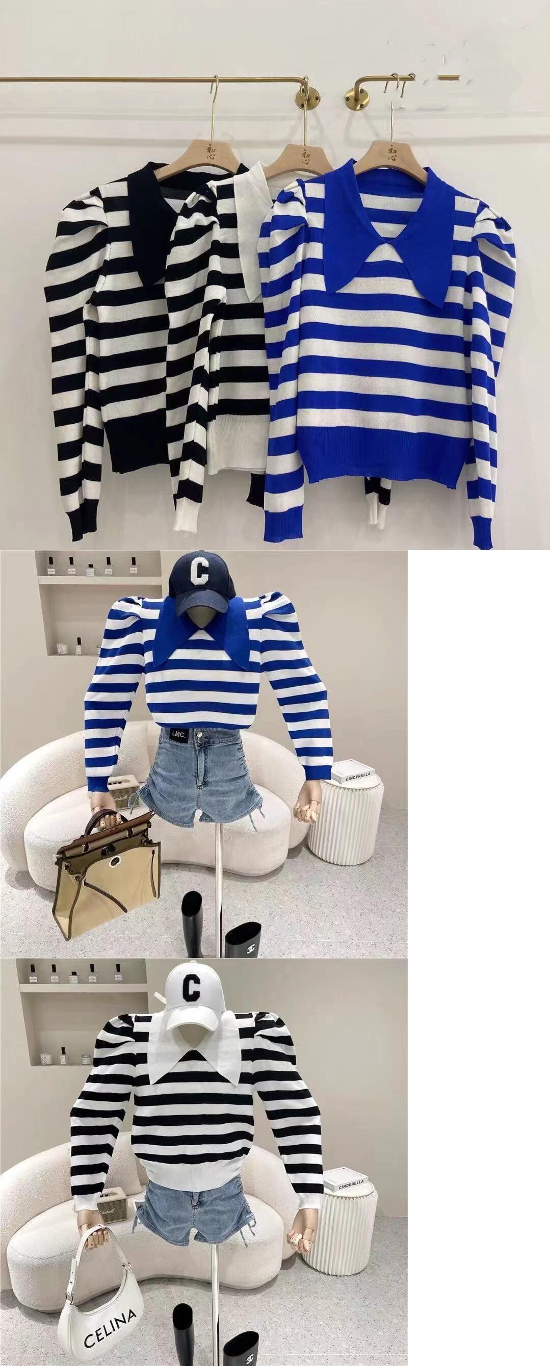 ラペルブラックホワイトストライプセータープルオーバーパフスリーブニットクロップトップシャツレトロシックなスリムワイルドセーター