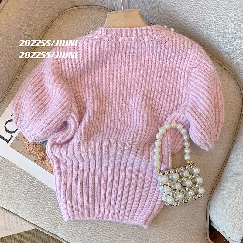 ジャンパー ピンク パープル パール ショート スリーブ セーター レディース サマー ランタン ラインストーン ニットウェア トップ プル ビーズ 半袖 ハーフスリーブ 夏物 真珠