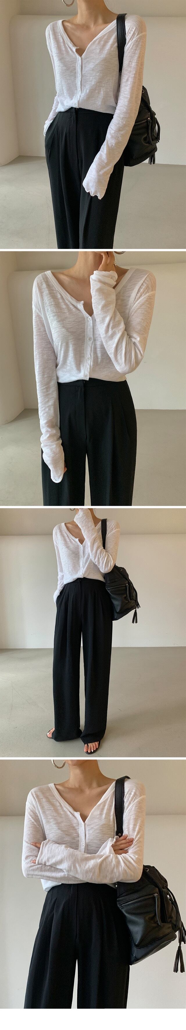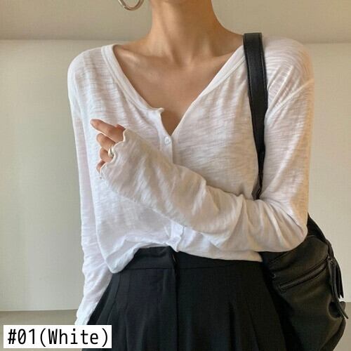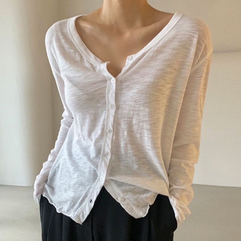 V ネックワイルドシングルブレストカーディガン長袖日焼け止めトップ春白 Tシャツの基本的な Tシャツ綿 Tシャツ ロング ホワイト コットン スプリング 春物