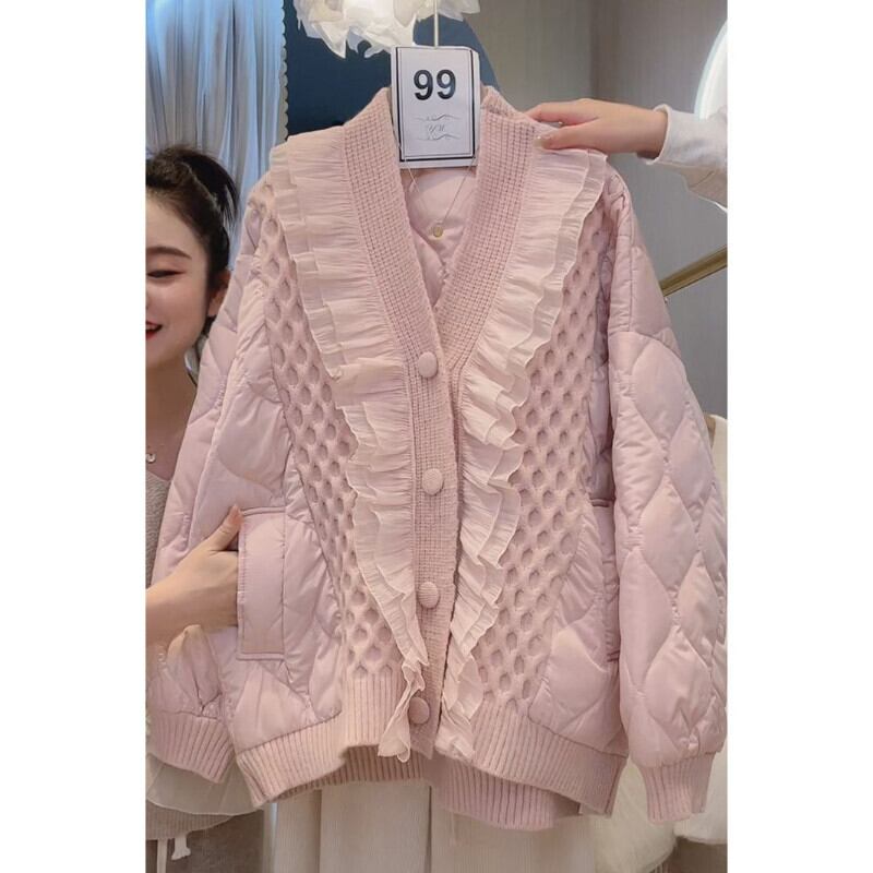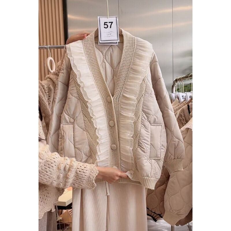 シックなフリルニットパッチワークパーカー春秋の因果長袖 V ネックジャケットスウィートパーカーコートカーディガン ロング 大人ガーリー キュート カジュアル スプリング 春物 オータム 秋物 Vネック