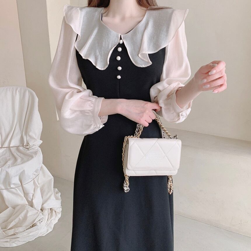 甘いコントラスト フリル襟 パールボタン ロングスリーブワンピース Aラインワンピース Vestidos de OL気質 長袖 大人ガーリー スウィート キュート カジュアル 真珠