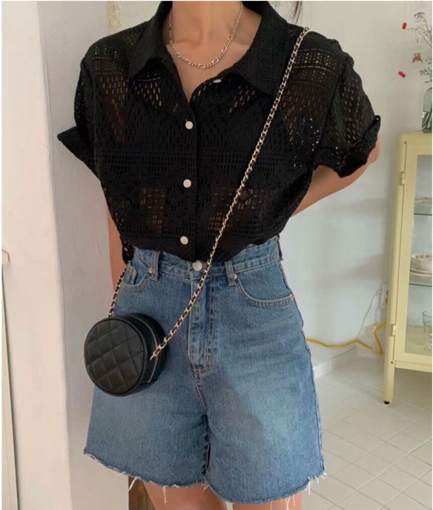 夏のカーディガンラペルシングルブレストルースレースカットアウト半袖シャツレディースブラウスかぎ針編み ショート ハーフスリーブ サマー 夏物