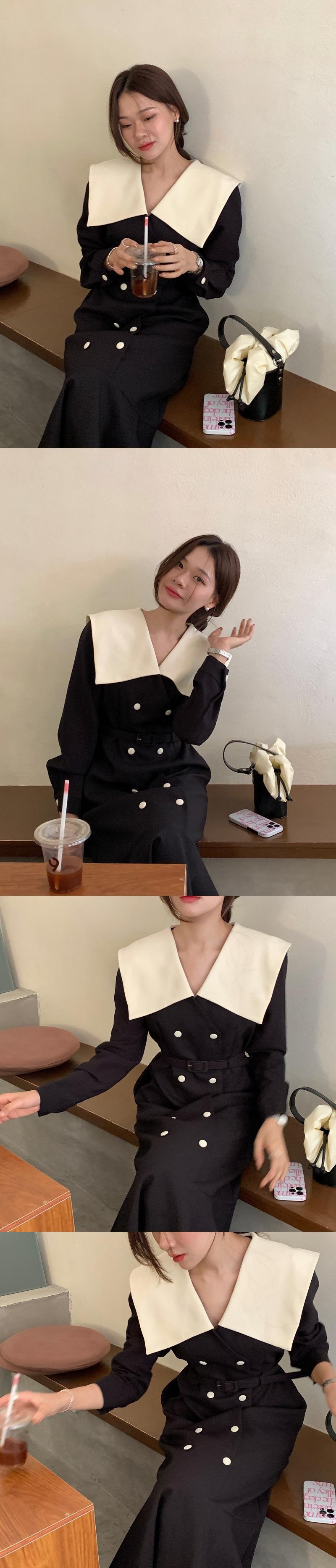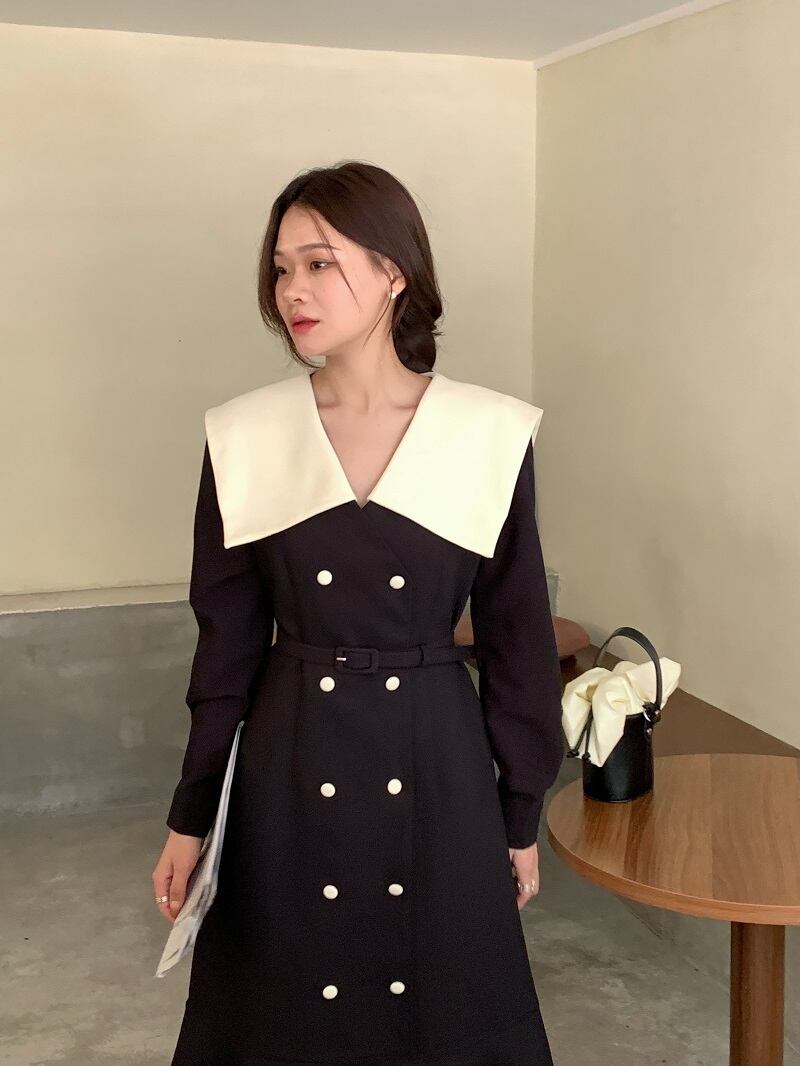 コントラスト大ラペルダブルブレストレースアップウエスト長袖黒マーメイドドレスベルト Y2k ドレス ロング ブラック ハーネス