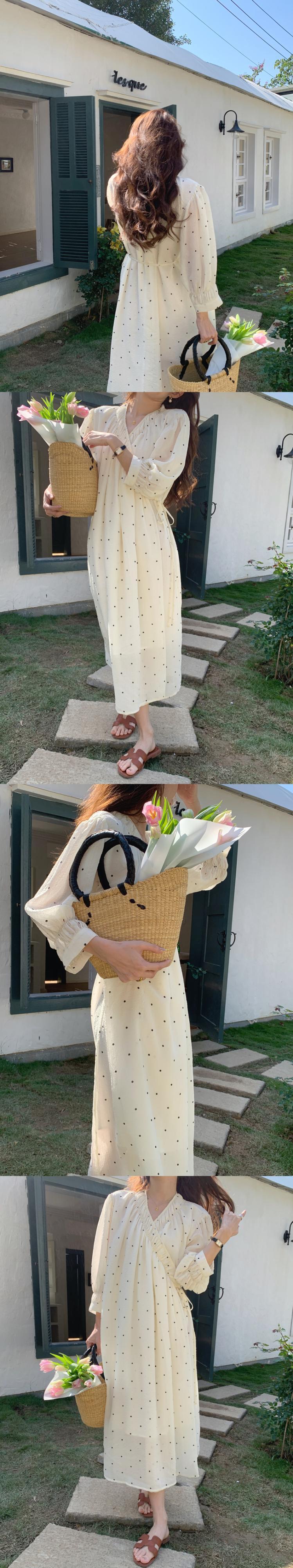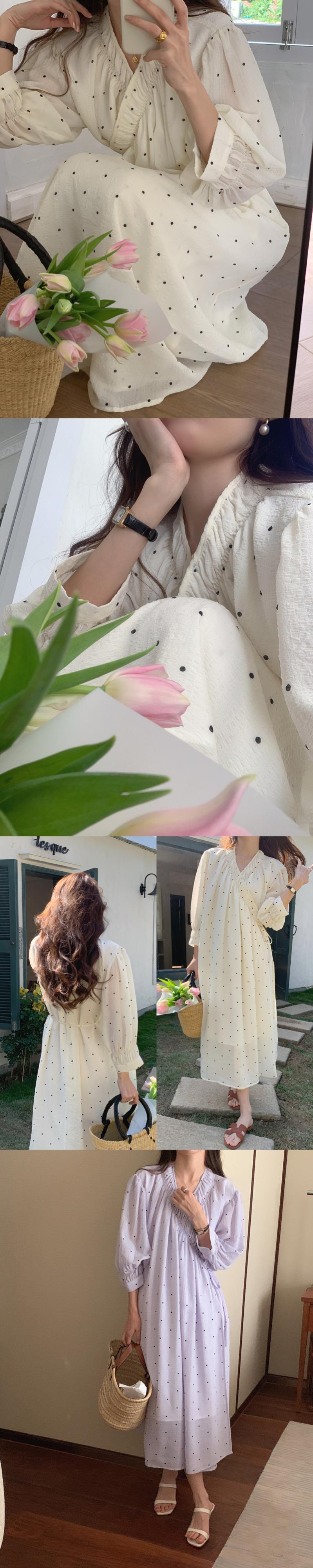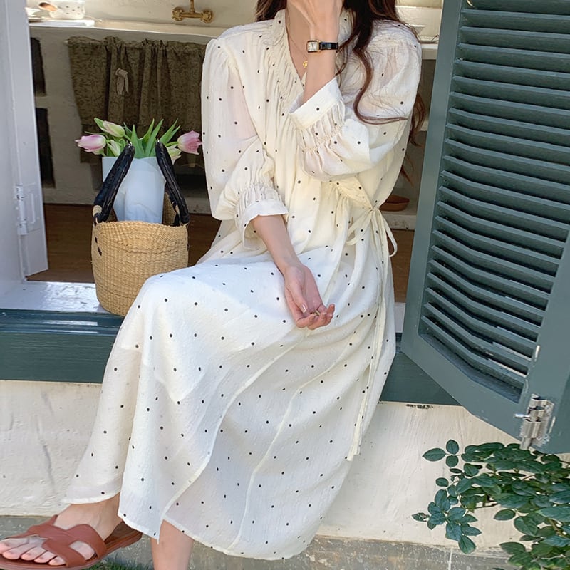 パフスリーブウエストワンピースレースアップ春VネックコントラストポルカドットドレスレディースルースVestidosデ スプリング 春物