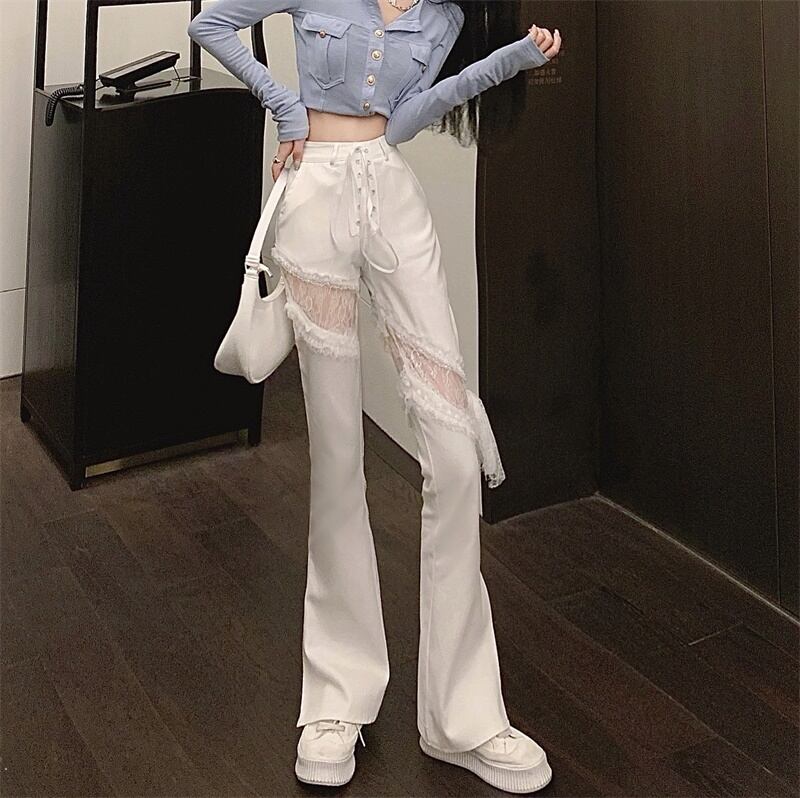 ウエストスリムスプリットホワイトフレアパンツストレートワイドレッグレースのズボン中空アウトジーンズ貨物 Pantalones レッド ワイドパンツ