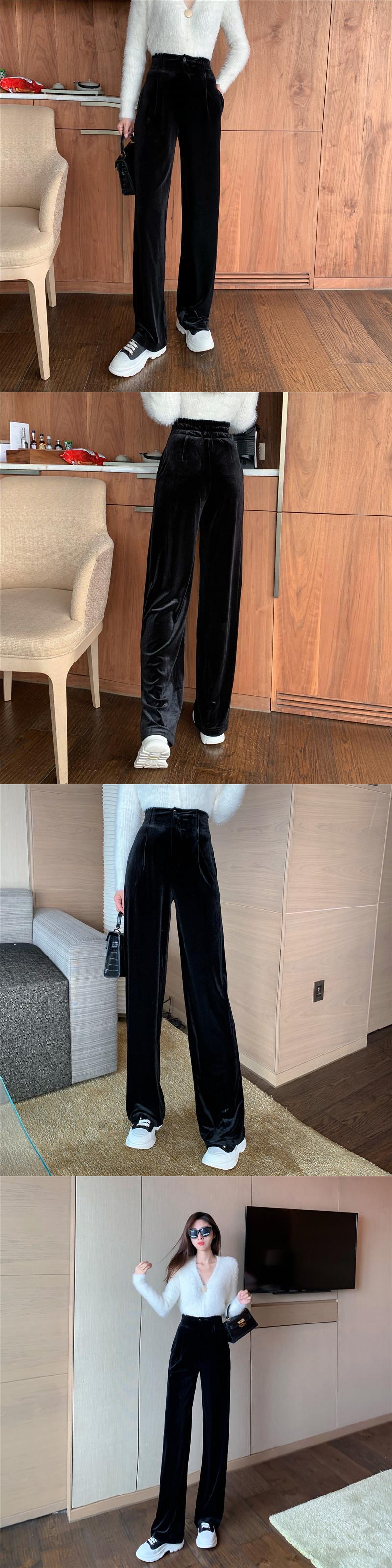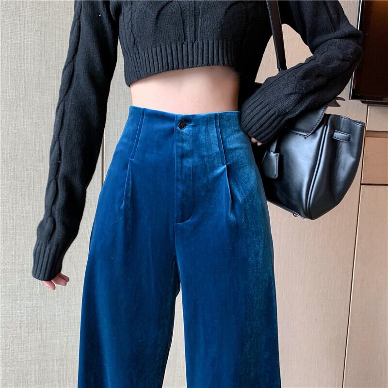 ウエスト緩いストレートワイドレッグブルーベルベットパンツストリート黒スウェットパンツ春ズボンストリート ブラック スプリング 春物 ワイドパンツ