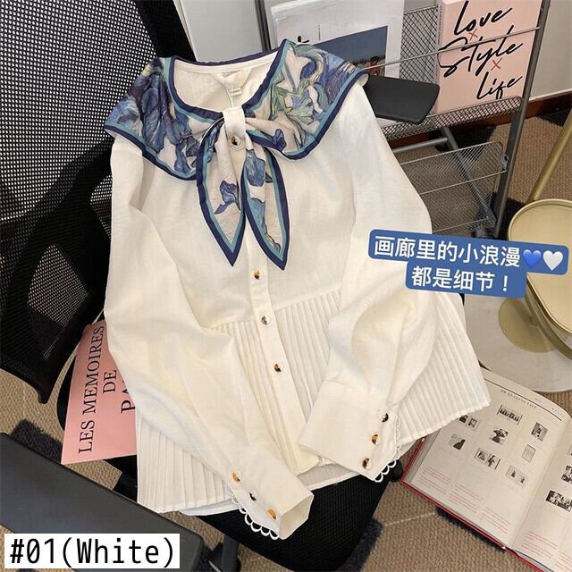 es 長袖 白シャツ プリント セーラーカラー トップス ドールシャツ レディース プリーツ フリル フェイクツー ブラウス ロング ホワイト
