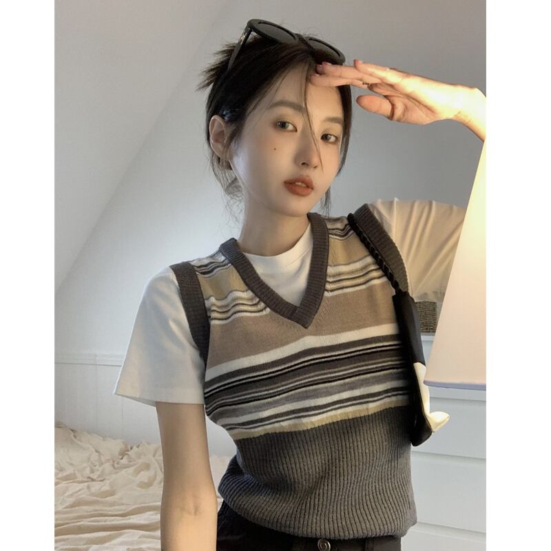 コントラスト V ネック ストライプ ニット ベスト トップス スリム プレッピー スタイル Y2k ノースリーブ セーター Colete Feminino 春 Roupas ベスト スプリング 春物 Vネック